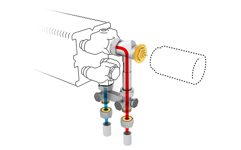 Adapter voor het ombouwen van thermostaatventielen met thermostaatkop, om te voorkomen dat koudwatertoevoer in de zomer door de thermostaatkop afgesneden wordt.